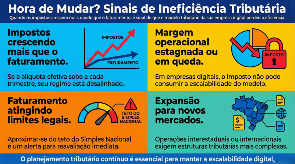 O planejamento tributário para empresas digitais analisa exatamente esse ponto de inflexão entre simplicidade e eficiência.