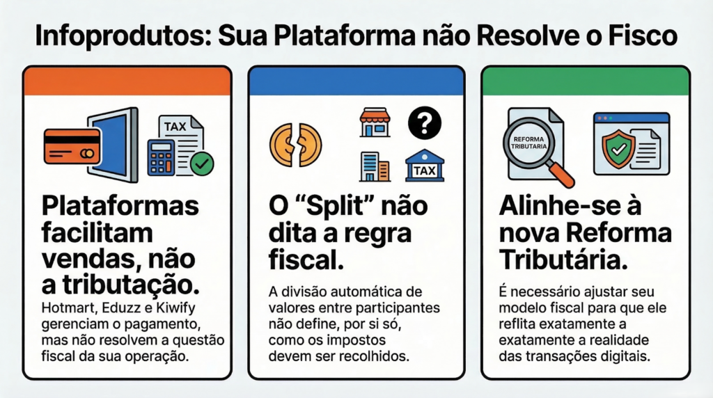Esse cenário exige atenção especial ao chamado split de receitas digitais, prática comum no mercado de infoprodutos. A forma como os valores são distribuídos entre produtores, coprodutores, afiliados e plataformas pode gerar riscos fiscais relevantes se não houver uma estrutura contábil adequada.